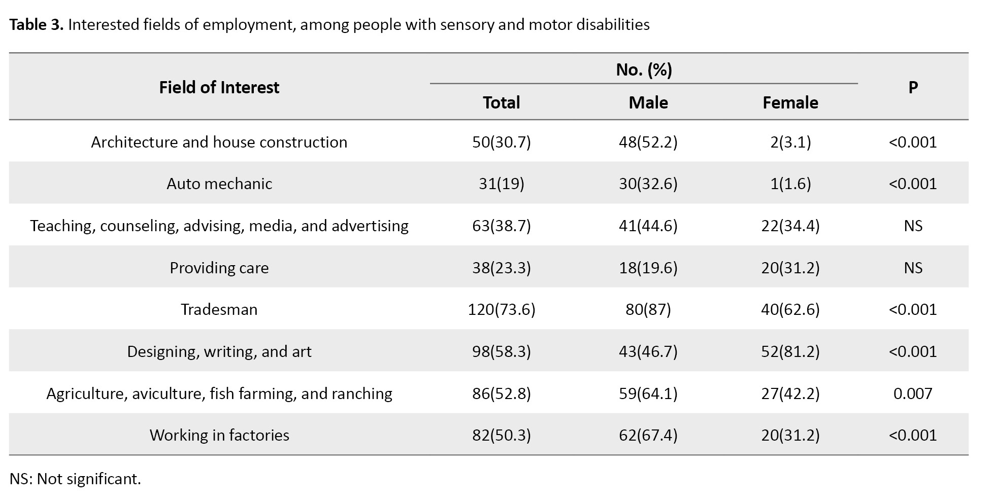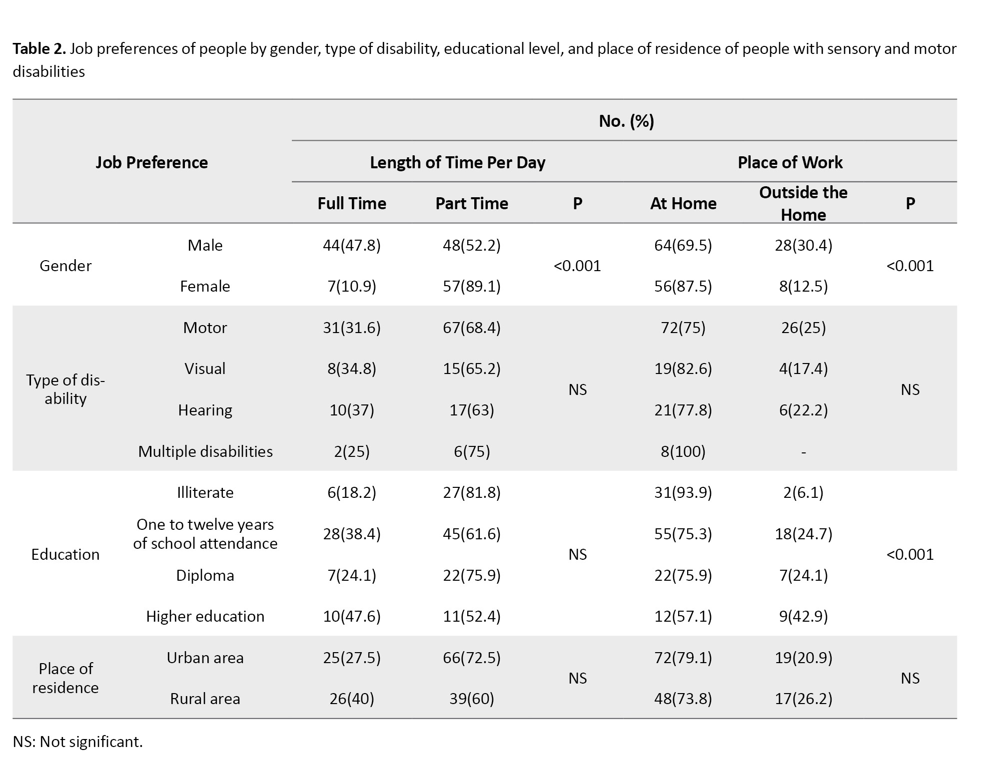 Some employers believe that people with disabilities do not want to work at all, which might negatively affect their decision to hire people with disabilities [15]. Based on the findings of the present study, 96% of working-age people with sensory and motor disabilities desired to work in Namin. This result indicates that the above-mentioned belief of employers is not right, which is in line with the results of a survey in the United States (2011), showing that 80% of people with disabilities were eager to work in this age group [16]. Therefore, if the initial job evaluation and training of people with disabilities take place correctly, it is hoped that people with disabilities will be able to participate in work environments actively.