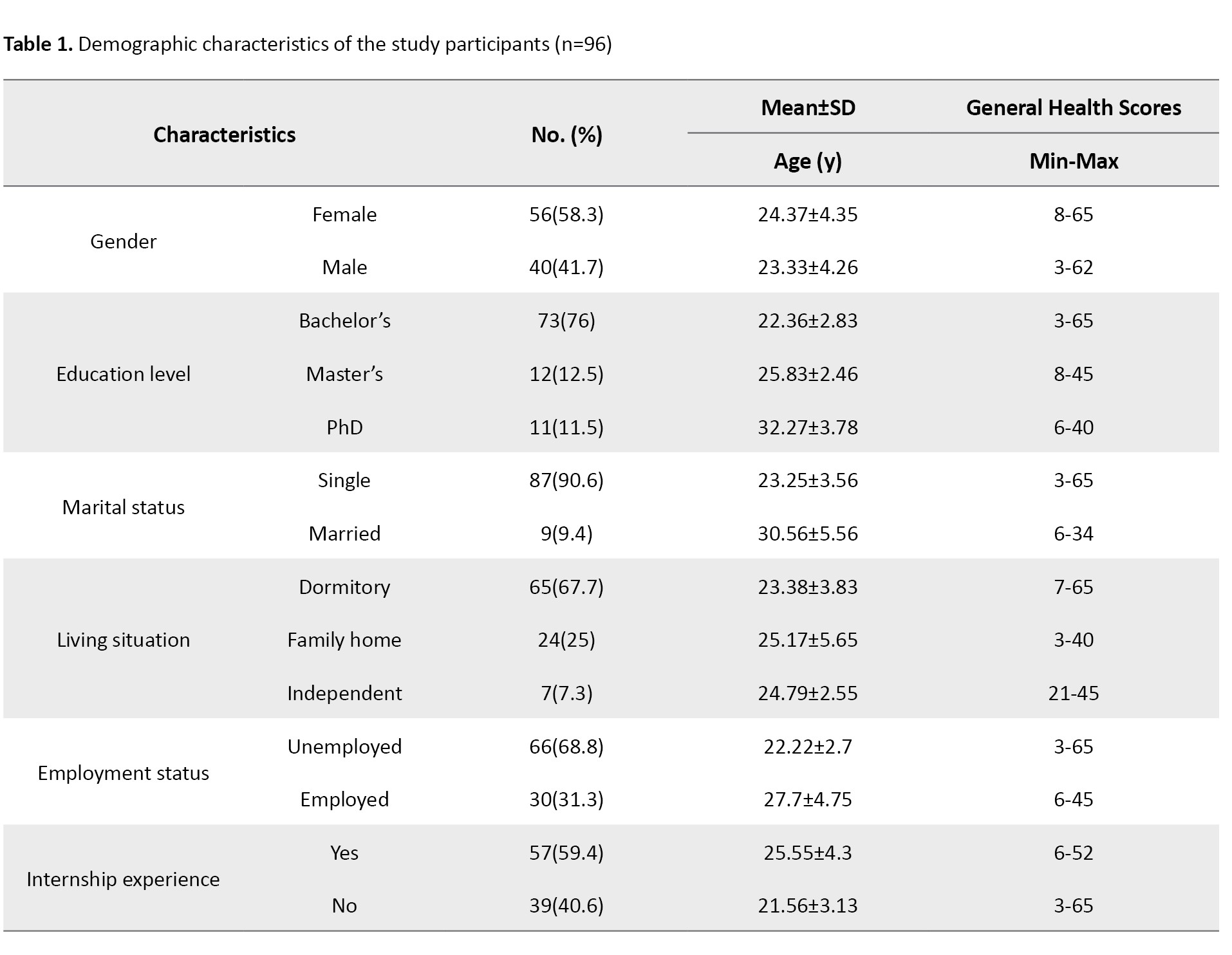 A total of 96 OT students from the Iran University of Medical Sciences, including undergraduate, master’s, and PhD students aged 18–38, participated in this study. Based on the result, 54 participants (56.25%) were at risk for general health disorders.