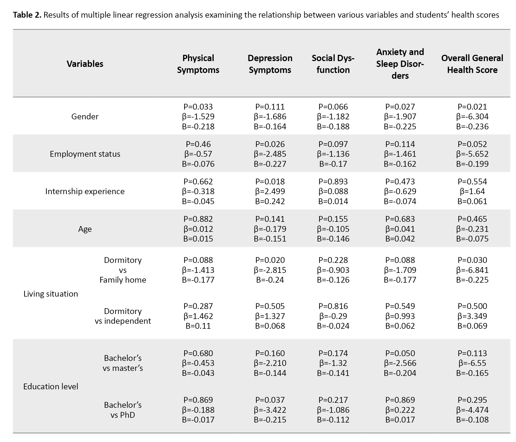 Considerable associations were noted between place of residence and general health scores, physical symptoms, social dysfunction, depression symptoms, anxiety, and sleep disorder symptoms. Students living with their families at home had mean scores 6.841 and 2.815 points lower in the general health and depression sections, respectively, compared to dormitory students (P=0.030, B=-6.841 and P=0.020, B=-2.815). This association was not significant in the other dimensions of physical symptoms, social dysfunction, anxiety, and sleep disorder symptoms. No significant differences were observed between dormitory students and those living independently at home (